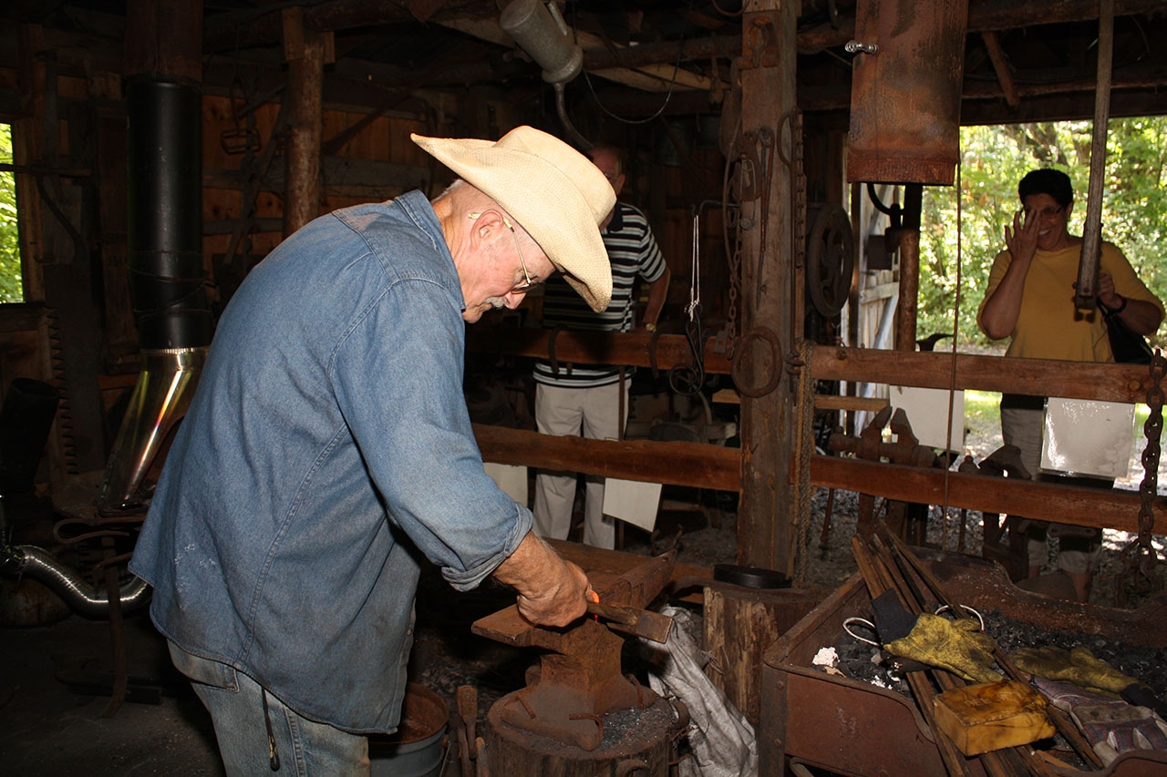 Located near the center of the 60-acre living history complex is a tree shaded pathway called Crafters Alley, along which are located interesting cottages and buildings. In each building you may find a craft person working on their specific, individual craft. Though most often present and working on weekends, there is often one or two presentations throughout the week.