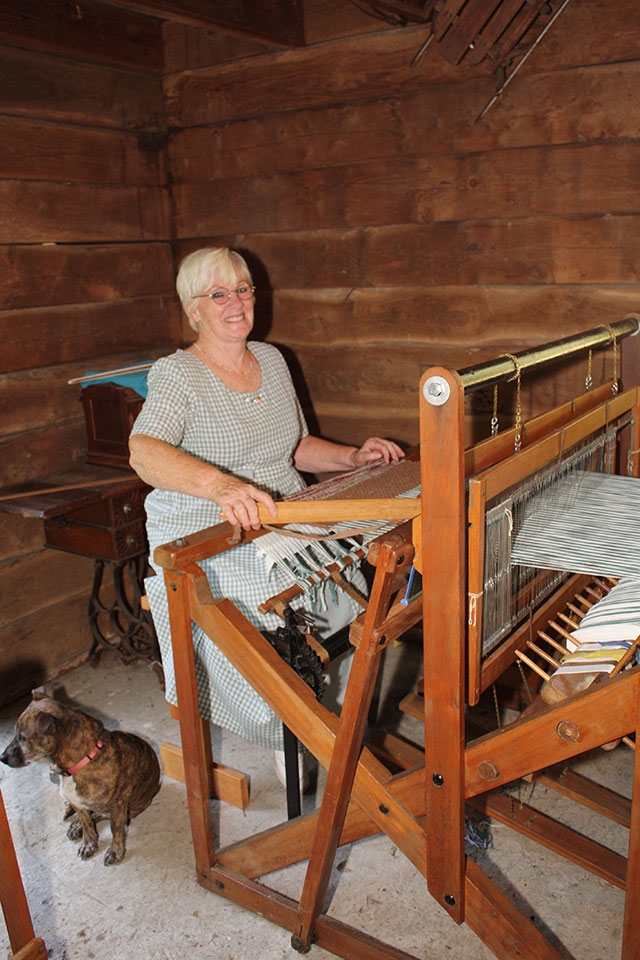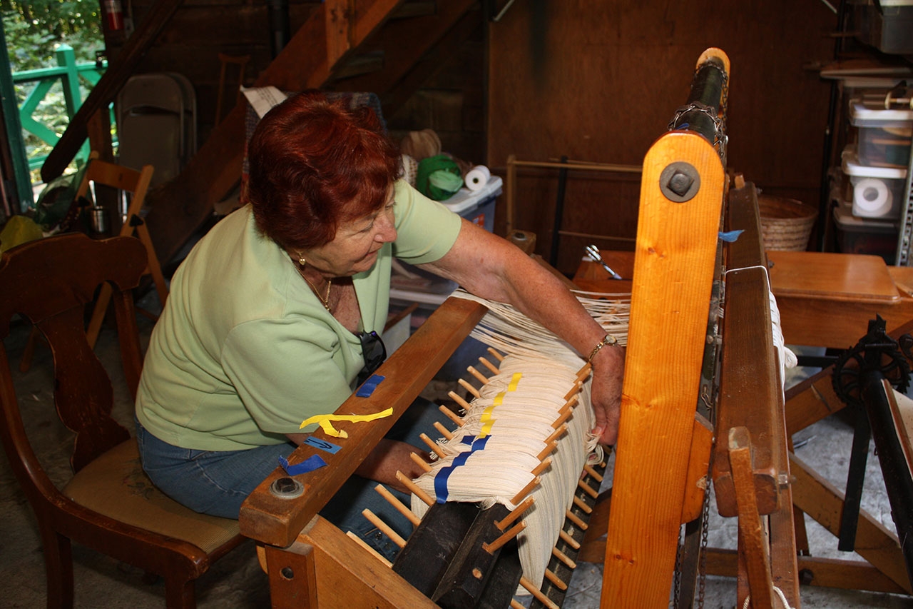 Across the way from the old broom shop is a rather unique looking, two story building. It was built by the Pioneer Log Cabin Company in 1930 as the Toboggan House for the then existing Pioneer Hills Ski Resort. To save it from destruction, it was moved to Wellington Farm USA, totally restored and it is now the farm’s Loom House. Located inside are four working looms. More often than not you will find weavers and spinners at work there creating everything from fine wool yarn to rugs made from worn out clothing, a practice which was very common during the hardship of the Great Depression.